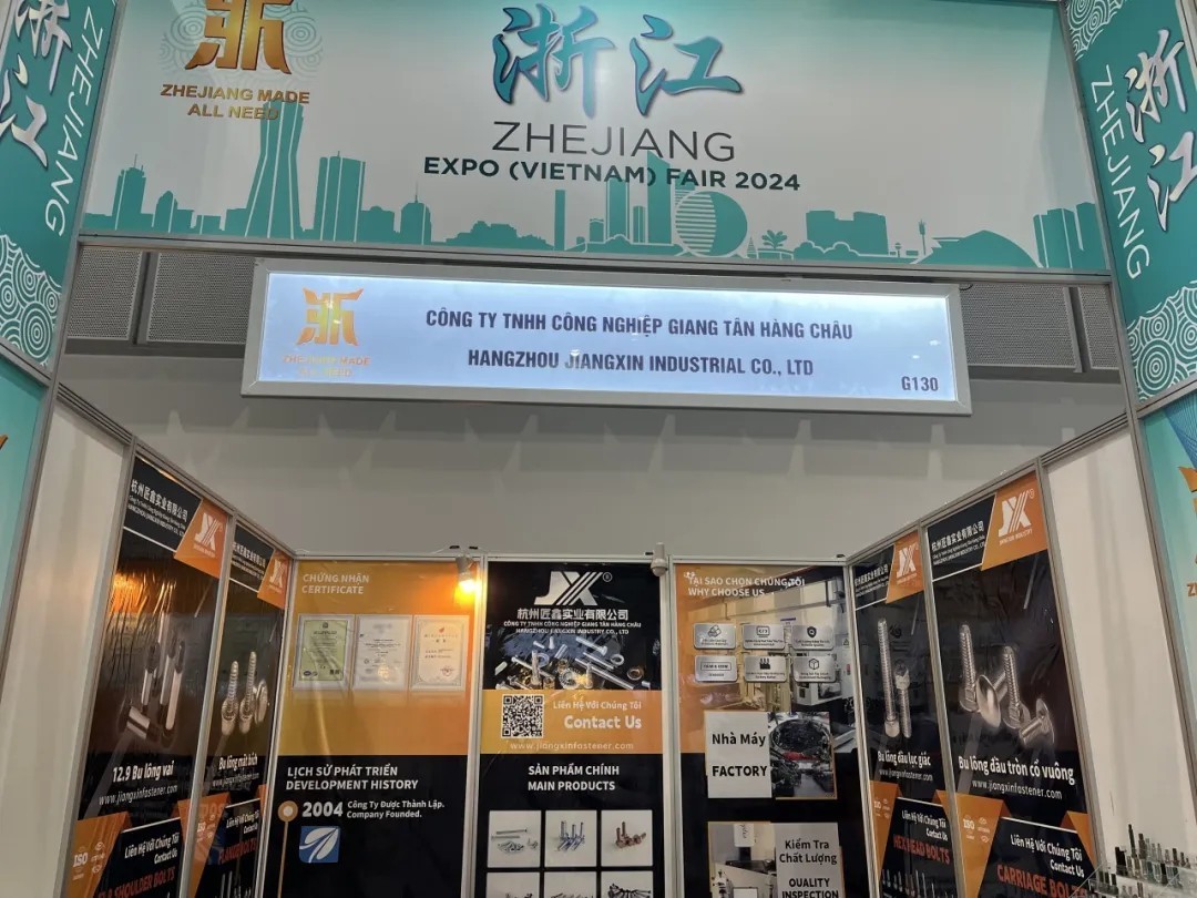 A exposição atraiu muitas empresas e compradores de todo o mundo, demonstrando a força inovadora da indústria manufatureira de Zhejiang. As exposições da Hangzhou Jiangxin Industry Co., Ltd, incluindo parafusos hexagonais (aço carbono e aço inoxidável), parafusos de máquina escareados cruzados/hexagonais, parafusos de máquina de cabeça cilíndrica hexagonal (aço carbono e aço inoxidável), etc., foram altamente favorecidos pelos compradores locais. e atraiu um grande número de consultas. Vale a pena mencionar especialmente que alguns parafusos perfurantes e auto-roscantes personalizados não padronizados também despertaram grande interesse de clientes no Vietnã e em outras regiões, e eles solicitaram amostras ativamente, indicando que há uma grande demanda no mercado.